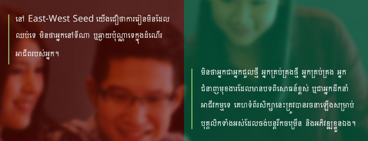 Learning@EWS ចាប់យក និងបង្កើតចំណេះដឹង ដើម្បីអភិវឌ្ឍជំនាញបច្ចេកទេស និងពង្រឹងសមត្ថភាពភាពជាអ្នកដឹកនាំរបស់បុគ្គលិករបស់យើង ដែលទាំងអស់រួមចំណែកក្នុងការលើកកម្ពស់ជីវភាពរបស់កសិកររបស់យើង។ វេទិកានេះគឺជាវិបផតថលចែករំលែកចំណេះដឹងរបស់ East-West Seed ដែលជាប្រព័ន្ធគ្រប់គ្រងការរៀនសូត្រសម្រាប់តម្រូវការសិក្សា និងការបណ្តុះបណ្តាល។